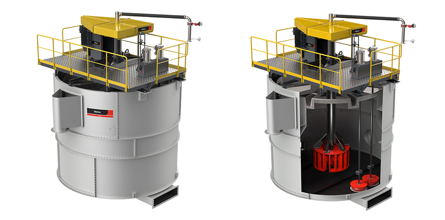 该搅拌机构设计可产生至槽壁的强大径向矿浆泵送以及至叶轮下侧的强回流,以最大程度降低表面磨损。此外,这是最大化叶轮上部矿浆再循环的唯一技术。